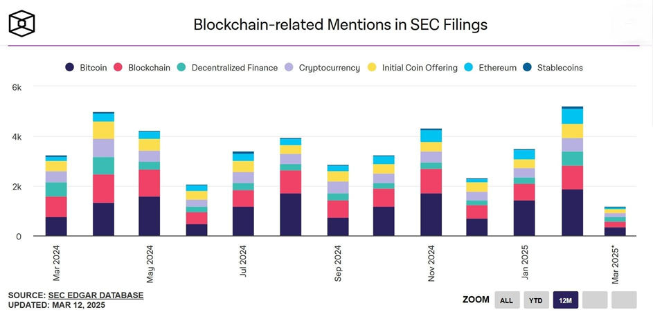 Số lần đề cập đến các từ khóa liên quan đến blockchain trong các hồ sơ nộp lên Ủy ban Chứng khoán Hoa Kỳ (SEC) đã chạm mốc kỷ lục vào tháng 2/2025, với hơn 5.000 lượt đề cập trong cơ sở dữ liệu EDGAR của ủy ban.