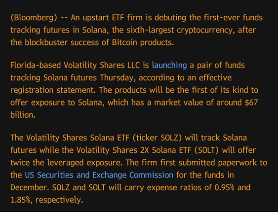 Vào tối ngày 19/03/2025, công ty quản lý đầu tư Volatility Shares thông báo chuẩn bị ra mắt hai quỹ ETF đầu tiên dành cho hợp đồng tương lai (futures) của Solana. Hai sản phẩm này có tên là Volatility Shares Solana ETF (SOLZ) và Volatility Shares 2X Solana ETF (SOLT), sẽ cho phép các nhà đầu tư có tài khoản môi giới chứng khoán tại Mỹ mở vị thế với Solana thông qua hợp đồng tương lai, với mức tiếp xúc tương ứng là 1x và 2x độ biến động của giá futures.