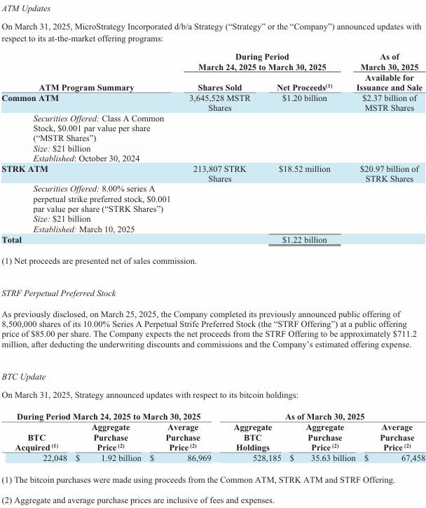Tuần thứ ba liên tiếp Strategy (tên cũ MicroStrategy) tiếp tục mua Bitcoin với quy mô lớn, bất chấp giá BTC đang dao động gần mức đỉnh. Công ty của tỷ phú Michael Saylor đã chi 1,92 tỷ USD để mua thêm 22.048 BTC, với mức giá trung bình 86.969 USD/BTC, theo thông báo chính thức ngày 31/03/2025.