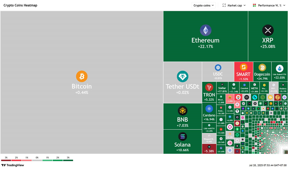 Tuần thứ ba của tháng 7/2025 tiếp tục là một cột mốc lịch sử với thị trường tiền mã hóa khi vốn hóa toàn ngành lần đầu tiên vượt ngưỡng 4.000 tỷ USD. Bitcoin và XRP đồng loạt thiết lập mức giá cao nhất mọi thời đại (ATH), trong khi Ethereum ghi nhận mức tăng hơn 20% trong tuần, chủ yếu nhờ lực mua đột biến từ các tổ chức tài chính lớn.