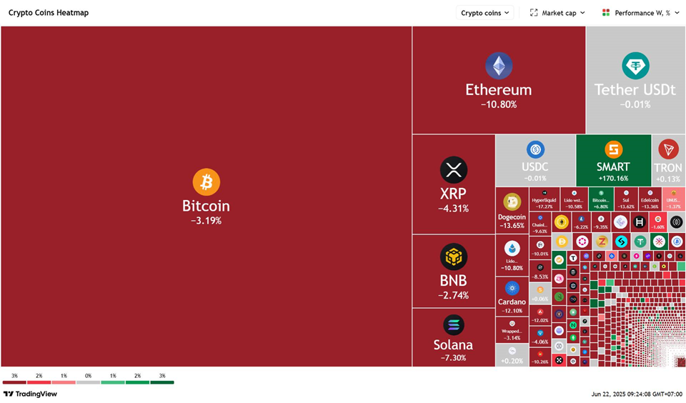 Tuần vừa qua, thị trường tiền mã hóa đã trải qua một giai đoạn điều chỉnh khi các yếu tố vĩ mô và địa chính trị vẫn chưa hạ nhiệt. Căng thẳng leo thang giữa Iran – Israel và việc Mỹ chính thức tham chiến đã làm gia tăng mức độ bất ổn toàn cầu, kéo theo làn sóng bán tháo trên các thị trường tài sản rủi ro, trong đó có tiền điện tử. Tuy nhiên, bên cạnh sự suy giảm giá ngắn hạn, thị trường vẫn ghi nhận những diễn biến tích cực từ hoạt động tích lũy của các tổ chức và tiến triển pháp lý tại Mỹ, mang lại hy vọng cho nhà đầu tư trong trung và dài hạn.